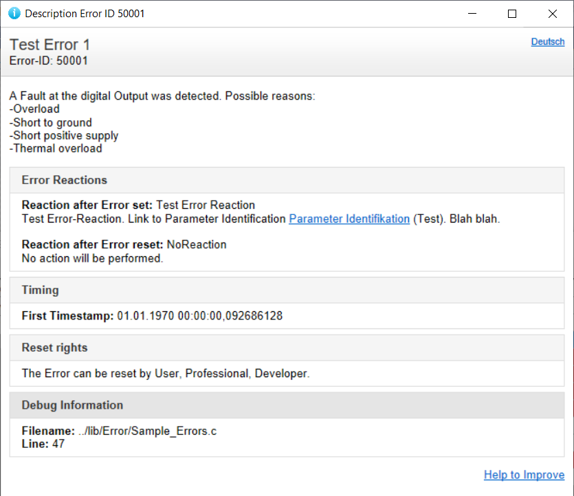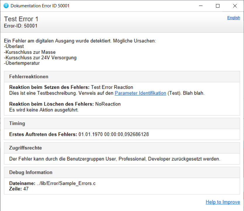 Text and description are displayed in the error-log. The helptext is shown on pc after pressing F1. It can contain several lines in german and english. See page Help-texts in Errors for details.
