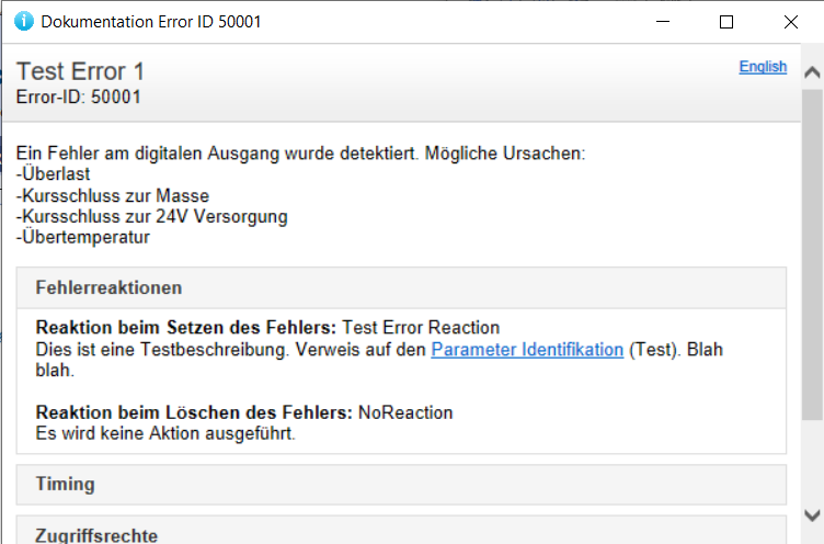 DefineOnErrorReaction(TestErrorReaction, "Test Error Reaction", "DOC_D Dies ist eine Testbeschreibung. Verweis auf den "PARA_STR(PARA_ID_Identifikation)". " "Blah blah." "DOC_E Test Error-Reaction. Link to Parameter Identification "PARA_STR(PARA_ID_Identifikation)". " "Blah blah.")