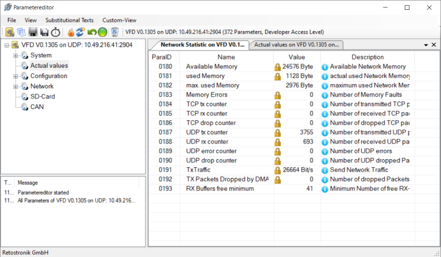 The parameterinterface is used to show and edit all system and user-parameters of connected devices. All parameters with their dedicated data and metadata are stored in the device and are transferred to the pc on establishing the connection. Due to this, a software update of the device does not need any update in the pc tool.